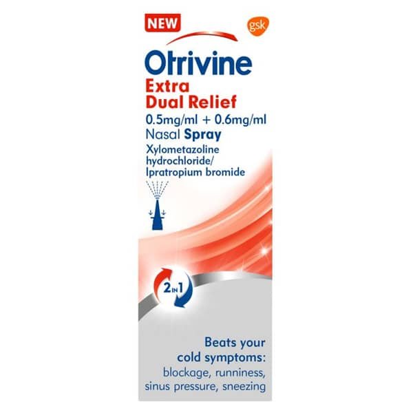 Otrivine Extra Dual Relief 0.5mg/ml + 0.6mg/ml Nasal Spray provides relief from the symptoms of nasal congestion and a runny nose due to colds.