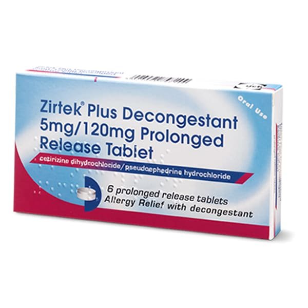 Zirtek Plus Decongestant tablets relieves symptoms associated with hay fever and other indoor allergies, such as blocked or runny nose, sneezing, itchy nose and eyes. Zirtek plus combines Zirtek (cetirizine) and a decongestant (psuedoephedrine hydrochloride) into one prolonged release tablet giving lasting relief or up to 12 hours control.