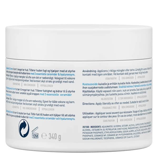 CeraVe Moisturizing Cream includes three essential ceramides and hyaluronic acid to effectively hydrate the skin and restore the skin’s protective barrier. Developed with dermatologists and suitable for dry and very dry skin on the face and body, this rich, non-greasy, fast-absorbing moisturizing cream features our patented MVE Delivery Technology to release a steady stream of moisturizing ingredients throughout the day and night. CeraVe Moisturizing Cream with ceramides is fragrance free.