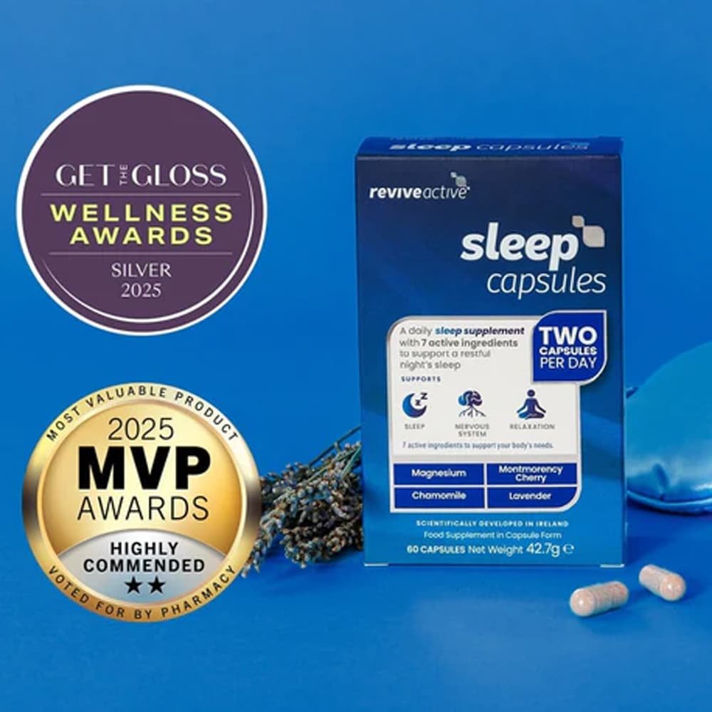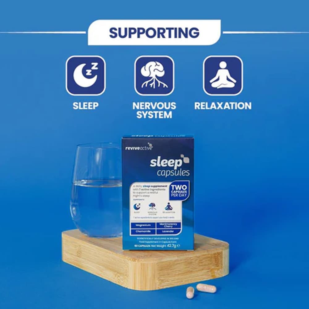 Sleep is a two capsule daily dose supplement, featuring Magnesium, Montmorency Cherry Extract and Chamomile to help you unwind before bed.